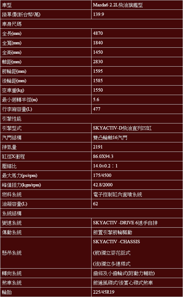 首先接觸全新世代Mazda6的車型,是預售價格新台幣139.9萬元的Mazda6 2.2L柴油旗艦版。