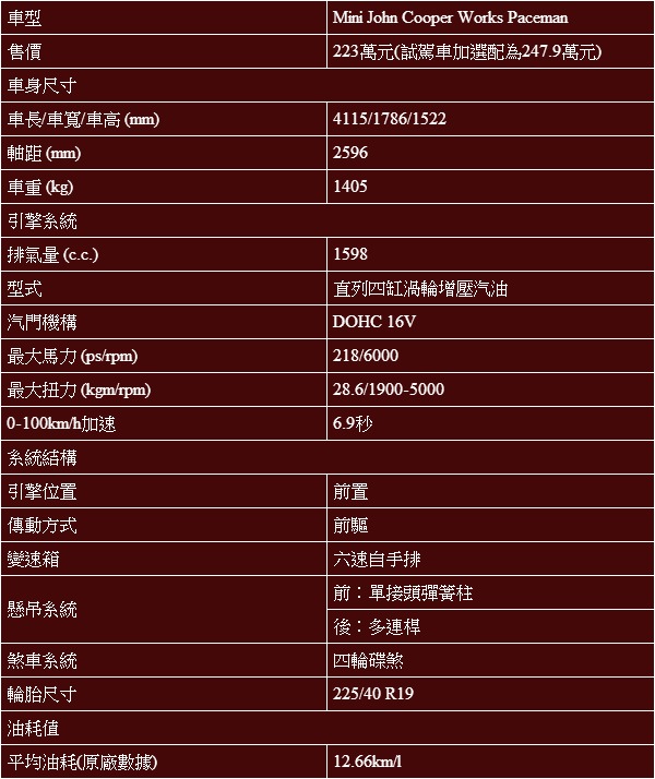 也就是說,John Cooper Works Paceman真的很不錯,當你如果就是想要一款洋溢濃厚Mini性能味道Crossover的時候,這真是一款讓人開懷不已的好車,同時還可以無拘無束輕鬆帶你遊山玩水;回到城市、將車洗一洗,再開去夜店門口同樣吸引所有人注目。可別忘了今天這輛試駕車還選配有Lounge真皮內裝、19吋銀黑雙色調鋁圈、黑底座頭燈組、紅色車頂與後視鏡蓋、引擎蓋與尾門貼條、前座中央扶手、Chili Red飾板與藍牙/USB音樂介面,這些加起來又要多添25萬元的配件,更讓這輛John Cooper Works Paceman閃閃發光炫氣逼人。