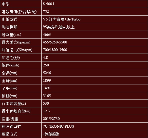 S 500 L搭載著4.7升雙渦輪增壓V8汽油引擎,具備455hp最大馬力與700Nm峰值扭力輸出。
