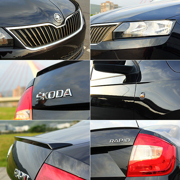 從主要的安全配備到動力表現,不能免俗的,還是要回到Rapid的外型設計。在Škoda導入全新的家族設計語彙之後,Rapid的外型設計同樣也出自首席設計師Jozef Kabaň之手。操刀過Bugatti Veryon的Jozef Kabaň,以捷克的著名工藝產業水晶玻璃為零感,將水晶玻璃上的切面轉化為車身鈑件的摺線。於Rapid身上,包括、頭燈、引擎蓋與尾燈及車尾排罩安裝處的各個線條,都好似水晶玻璃的切割面,雖然簡單卻有著多變的光影變化。再搭配頗具氣勢的直瀑式水箱護罩與廣闊的氣壩輪廓,雖然Rapid的體型嬌小,卻散發著大車般的氣勢,就如同其標配的各項安全配備一般,不因為定位在入門小型房車而有所妥協。