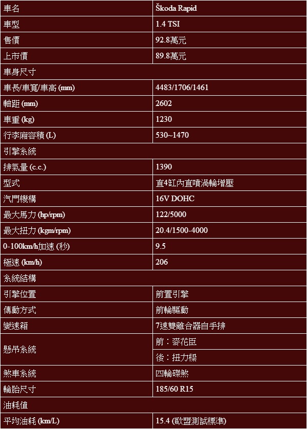 15.4km/L的平均油耗與相對樸實的配備水平,清楚表示Rapid走的是一條經濟卻不失安全性的定位訴求。