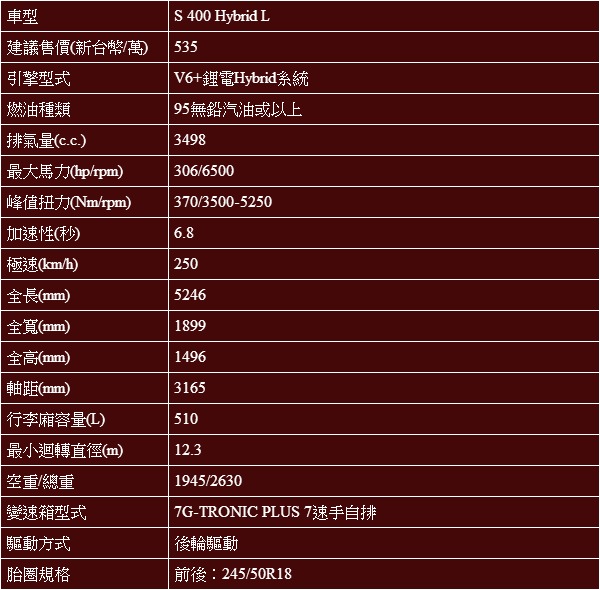 動力面雖然不如S 500 L來得飽滿暢快,輸出曲線也沒有那種隨傳隨到的充沛,但對於一輛旗艦房車而論,S 400 L Hybrid仍是足敷使用的夠水準。