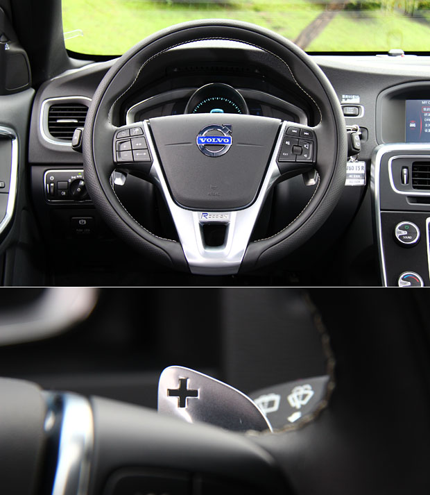 R-Design透氣式真皮跑車握感方向盤,含專屬徽飾與鋁合金嵌飾板,後方也標配換檔撥片。