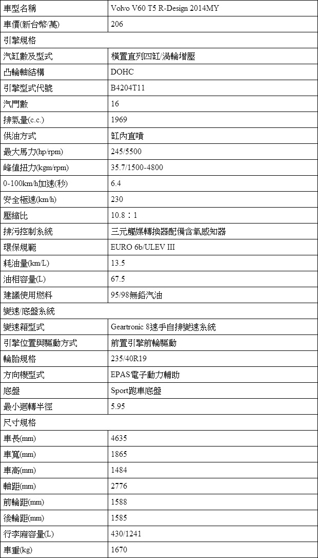 正2014年式車型Volvo V60 T5 R-Design售價為新台幣206萬元。