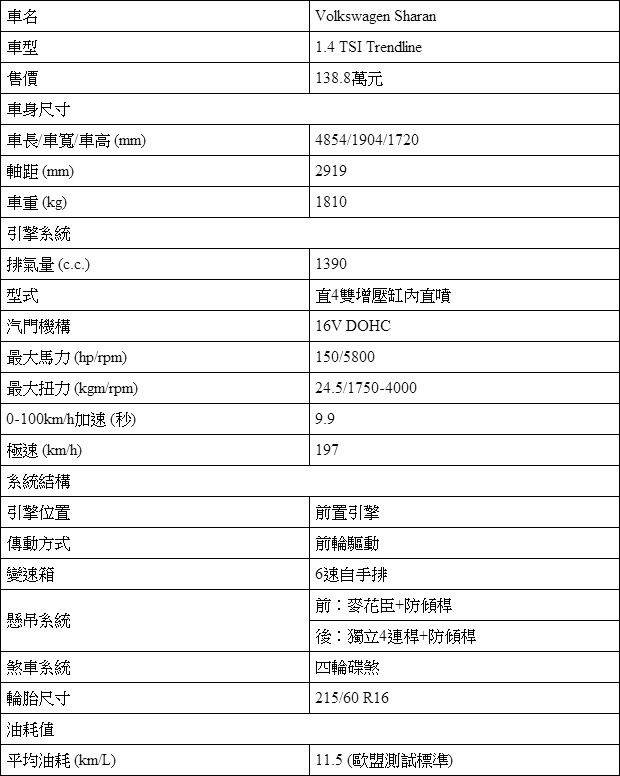 睽違8年之後,Sharan再次回到臺灣市場,更趨方正且近似於Volkswagen掀背車的外型設計,再加上充裕且具彈性的空間表現,以及充裕的安全配備,Sharan挾帶的堅強的產品實力再次站上臺灣市場。搭配138.8萬元起能不能成功吸引消費者的目光,雖然有待開始交車後的掛牌數證實,但若真的有多人乘載的需求,Sharan確實能夠符合我內心設定的條件,即使上還有2.0 TDI引擎與高階車型,但1.4 TSI TL已能滿足所需。