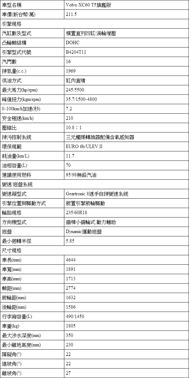 XC60 T5旗艦版標配18吋輪圈規格,對應輪胎尺碼為235/60R18。
