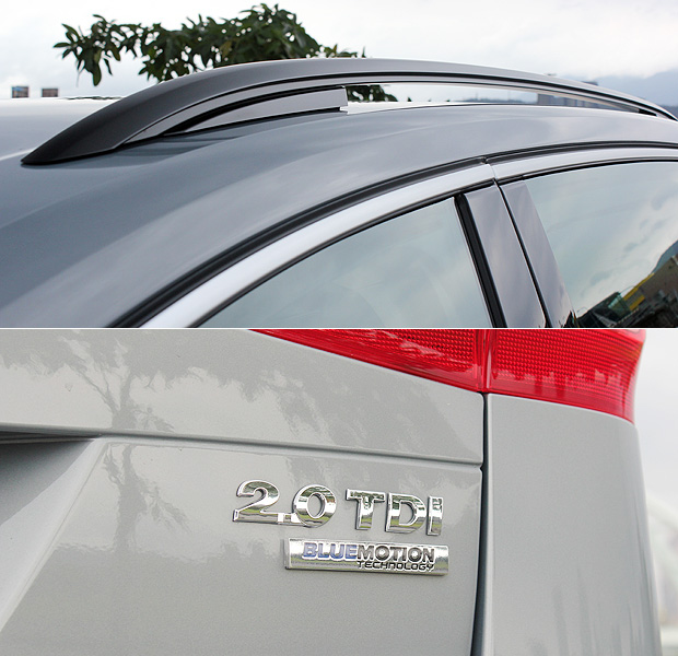 從外觀察,2.0 TDI CL與1.4 TSI TL其實相去不遠,雖然原先試駕的1.4 TSI附有車頂架,但由於該車配備與標準的1.4 TSI TL有所差異,所以分辨2.0 TDI CL與1.4 TSI TL除了透過車尾的動力銘牌辨別外,還可透過車頂架的有無來區分。1.4 TSI TL是全然平順的車頂,而2.0 TDI CL則會搭配黑色的車頂架。