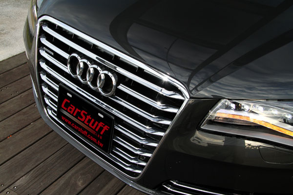 除了LED,一體化大型前氣壩也是Audi旗下車款的另一個特色,A8 L 4.2 FSI在同樣採到梯字型設計下,以全鍍鉻方式提升質感,由下而上漸層橫柵設計,讓整個氣壩就有如一件大師雕塑的工藝作品般,突顯出旗艦房車的氣勢。