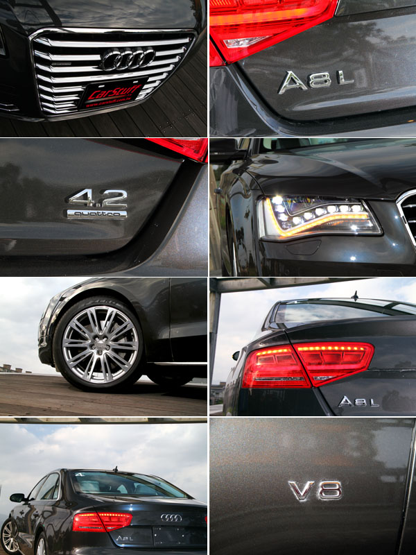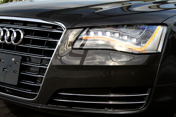 而在A8車系中的搭載V8動力系統車型更是將全LED頭燈列為標準配備,同時還具備了全天候智慧動態照射控制功能,以10具LED燈具組與透鏡組成頭燈祖,並且依據分別負責包括近光燈、遠光燈、全天候燈、轉向輔助照明、方向燈、極限LED辨視燈、定位燈等照明工作,因此在頭燈組內完全看不到傳統的圓柱狀地投射燈組,整體造型有如鋼鐵人的銳利眼睛,再一次展現無比的科技感。尾燈部分同樣完全採用LED燈具所組成,徹底將LED科技運用到最大化,而且Audi畢竟是大量採用LED科技的鼻祖,將燈組完美的車輛整體設計中,完全不會有任何地庸俗感。