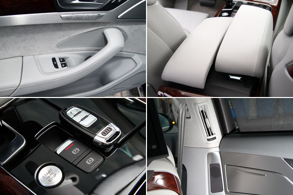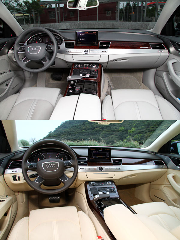 進入A8 L 4.2 FSI座艙,可以感受到與以往Audi車款截然不同的設計風格,原廠表示自A8車系與即將引進的A7 Sportback車系開始,開始導入所謂類遊艇式的環艙奢華鋪陳手法,以包括真皮、鋁合金與木紋飾板等材質,相搭配地圍繞於乘客周圍,而且Audi向來在使用高檔材質上毫不手軟,其中車內大面積地金屬飾板與按鍵部分,都是以整塊旅合金切削而成,哪種屬於金屬的冷冽手感,是一般以塑料鍍上金屬漆的類金屬飾板所無法比擬的。