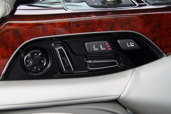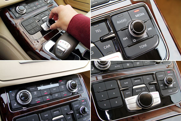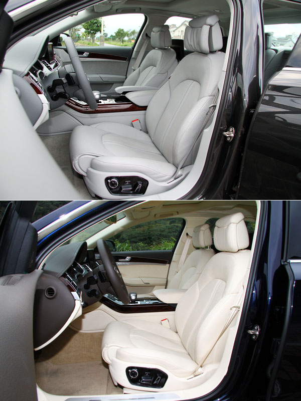 乘坐空間部分,A8 L 4.2 FSI全數標配Valcona 真皮座椅,皮革觸感相當細緻,並且前後配有四張獨立附按摩功能之電動可調座椅,其中前座部分具備達22向調整功能,而這回Audi將肩部、腰部等細節調解功能,整合於一組由四向按鍵與撥桿組成的介面中,並且同樣藉由中央的顯示幕顯示調整功能,但在實際使用時,發現過去將各細節調整功能鍵分開下,雖然按鍵較為繁瑣,但在使用時並不需要看著按鍵調整,只需用手指觸摸到所要調整部位的按鍵即可操作,而在新的系統上,卻必須將視線移至螢幕上才能了解調整狀況,感覺起來似乎有點多此一舉,但如此的設計,看得出來Audi相當堅持各項功能的調整都需在車輛停止下完成,讓你在行駛間完全專注於路況,增加安全,僅有音響與部分系統可藉由方向盤快捷鍵操作。