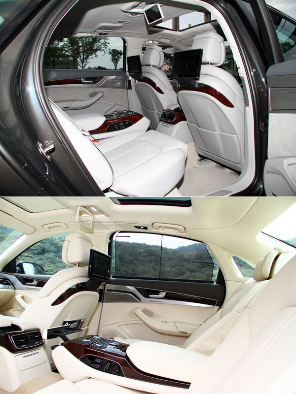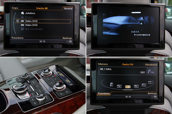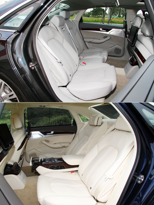 身為大型豪華房車,A8在後座的鋪陳部分也相當用心,在台灣引進的長軸車型,皆具備後座左右獨立影音、獨立恆溫空調與電動座椅等配備,空間部分也相當寬闊,不過當座椅延展斜躺時,椅墊前緣也會順勢向上提升,若是嬌小一點的乘客乘坐,可能會出現雙腳騰空的情形,座椅設計部分,似乎是以西方人的高大身材為基礎,若能增加椅墊前緣高低調整功能,將會更為完美。
