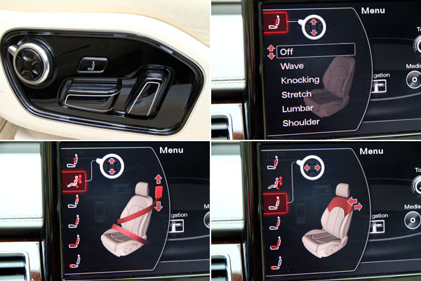 前座舒適型電動座椅 具有22向電動調整以及氣壓按摩功能,並且除了基本的椅面與椅背採傳統方向鍵操作外,其於細部調整與按摩功能皆整合於前方的多向按鍵組控制,並且由中央螢幕輔助顯示調整狀況。