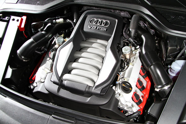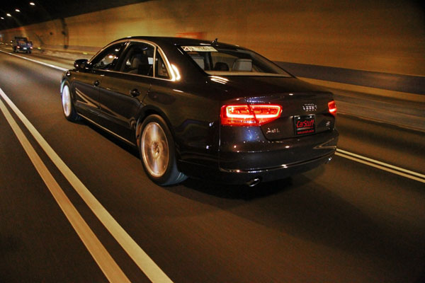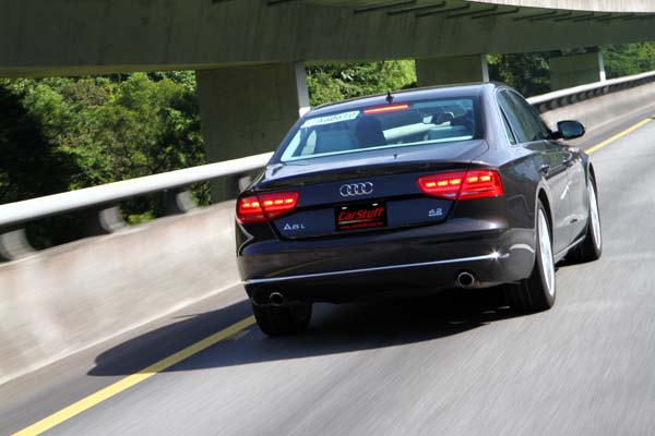 動力系統部分,其搭載排氣量為4163c.c.的V8 FSI缸內直噴引擎,並且搭配全新的八速tiptronic手自排變速系統與quattro四輪傳動系統,拜鋁合金與鋼質複合式車體結構所賜,讓A8 L 4.2 FSI車重僅有1885kg,0-100km/h起步加速數據為5.8秒;實際駕駛時,重踩油門起步加速,當踩下油門的瞬間會有約半秒的時間等待力道湧出的時間,而隨著轉速迅速提升,湧現的力量也越趨飽滿,往往駕駛這種大車時,會因為他高度地沉穩性,忘了它所具備的大動力與優異性能,直到車速提升至100km/h以上時,才會驚覺原來它的力量如此強大,而在全新A8上也配置了Audi drive select可程式車身動態系統,同樣是由MMI介面調整,具有comfort〈舒適〉、auto〈自動〉、dynamic〈運動〉與individual〈車主自訂〉四種模式,而該系統所改變的範圍不僅有懸吊系統,包括油門訊號、換檔速度等都會隨之變化,在individual〈車主自訂〉模式中,則可以由車主自行搭配懸吊、變速箱、動力方向盤輔助力道等模式。值得嘉賞的是A8 L 4.2 FSI所配置的主動式氣壓懸吊,在任何模式下,都還可以保有高水準的舒適度,在路感回饋與抑制碎震間取得不錯得平衡,不愧為Audi旗艦車款,面對惡劣的路面品質,擁有最佳的行路表現。
