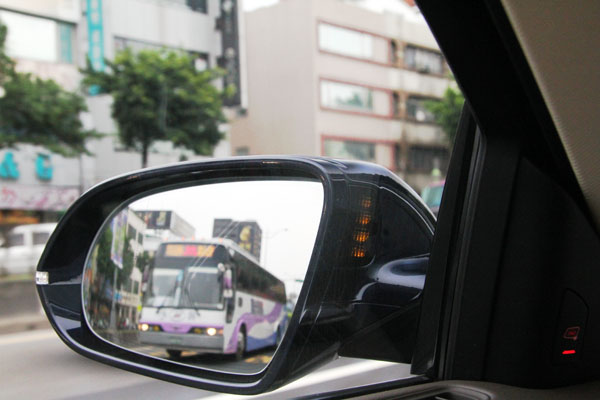Audi side assist 車道變換輔助系統當車輛側後方有車輛接近時,便會亮起後視鏡內緣的黃色警示燈。
