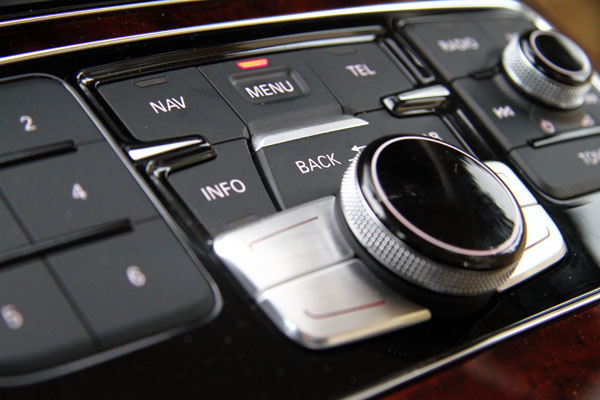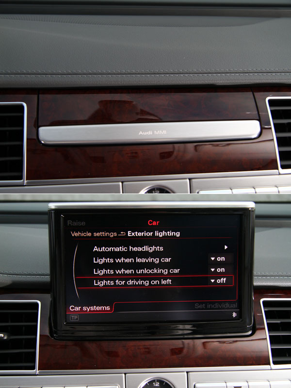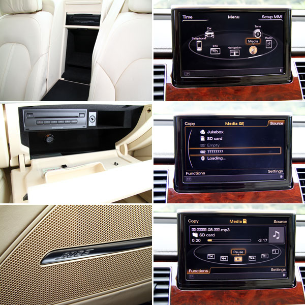 隨著全新A8問世,原廠也為其導入了全新一代的MMI介面與8吋顯示幕,除了將首頁功能選單以對應旋鈕的方式,改為圓弧狀設計,並且加入了圖像顯示,功能更為強大,其中在音響系統部份,還整合了Juke box數位音樂管理介面 (20GB)、DVD 播放器、DVD /CD 換片機、Audi Music interface多媒體播放器連接埠等功能,空調系統與細部座椅調整顯示也都整合於其中,不過可惜的是,國外車款所擁有的Google Earth導航功能並未導入,同時也完全沒有衛星導航功能,甚至也未有中文化介面,這讓被外界稱為科技旗艦的A8車系,成為同級車中唯一整合介面尚未導入中文化的車款,對於整合系統的中文化開發進度,慢得讓人匪夷所思。不過,儀錶版中的7吋高解析度DIS 駕駛者資訊顯示系統,於音樂選單中,卻可以顯示中文曲目,期盼Audi可以加快對於系統中文化的開發腳步,以利全球華人使用。