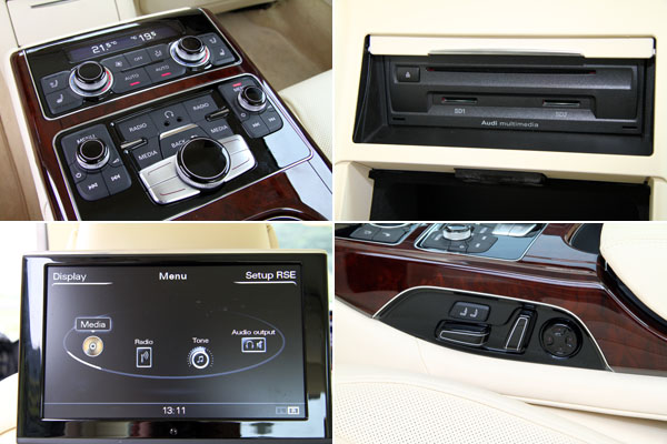 後座同樣配有獨立的MMI操作介面與分區恆溫空調,以及附有氣壓按摩功能的10向可調電動座椅等配備,並搭配兩組10.2吋高解析度螢幕、獨立Juke box播放介面 (10GB) 、獨立單片DVD播放器與後座Audi Music interface系統等。