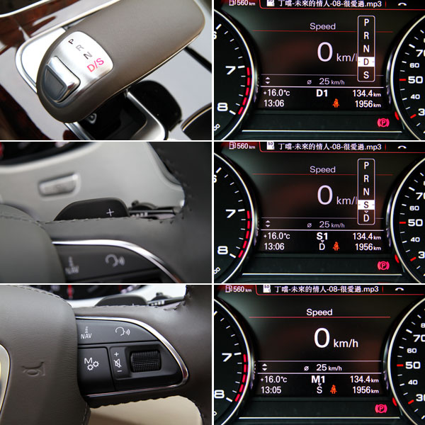 八速tiptronic手自排變速系統在D檔與S檔切換時,只需向後輕撥即可切換,但是欲換成手排模式時,則需由方向盤上的〝M〞字切換鍵,同時儀錶板中央的多功能顯示目下方也會顯示排檔模式。