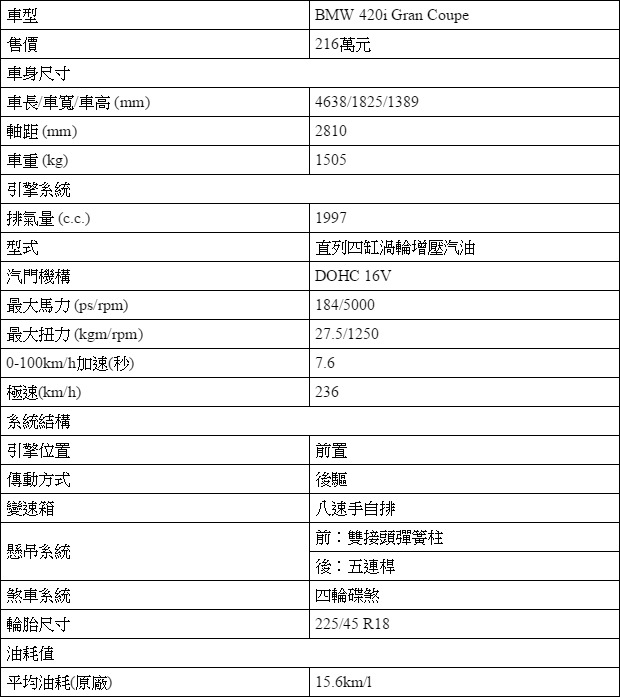 再重申一次,個人真的還是無法由衷愛上任何一款四門Coupe這種複合機能車型,不過單以420i Gran Coupe的表現來說,還真的難有令人大力挑剔之處,除非你像我一樣非雙門車不買,否則以其與320i Sedan相距不遠的售價(320i售價為192萬元,但是無任何Line配備的素顏版本),420i Gran Coupe不僅表現得體,而且幾乎能夠讓人因而更加迫近跑車的真意。