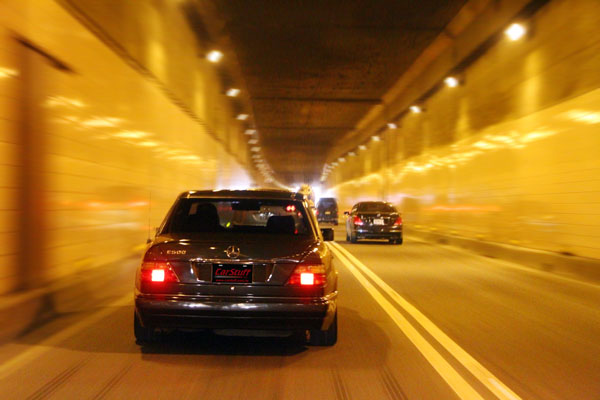 市區龜速的移動中,澎湃的聲浪遮掩不住E500的武力,但若相較之下,中高速時此V8引擎搭配四速自排變速系統的表現,是更顯活潑的,約莫80km/h之後的再加速,更為靈活的力道湧現立刻推動著車輛往前奔馳,速度指針加快右旋的速度,演前的景色開始快速掠過,且此力道似乎不見底的持續供給;就在筆者迷戀著此不間斷的力量癮度中,更同步發現E500那出色的底盤調效與整體NVH表現,在法定限速之內,風切聲抑制優異,車身穩定性更是無從挑剔,相較於當前高科技的電子式氣壓懸吊而言,雖然反應速度不及,但那給予駕駛的沉穩感…你不得不佩服E500的功力!