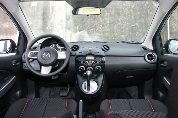 全新上市的Mazda2外觀改採家族化的「微笑」下氣壩設計,搭配更具整體感的新款16吋跑車鋁圈(Sport車型),使Mazda2更具個性化的嶄新特色。配合成熟洗鍊的時尚外觀,Mazda2內在也經過設計師巧手改造,新增時尚鋼琴黑中央面板,儀錶介面也換上更有質感的炫黑底全新設計,新增智慧型旅程行車電腦(Sport/頂級型),能透過方向盤上的整合式操作界面,輕鬆了解即時油耗、平均油耗、剩餘行駛里程等多項資訊;此外,兩旁的空調飾板也經過色彩調整,採用外黑內銀的鋪陳設計。