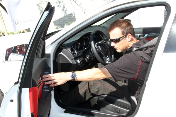 而在進行麋鹿測試的同時,也利用車輛的迅速重心轉移與偏移,感受ESP電子車輛動態系統介入修正車輛的情形,以及PRE-SAFE主動安全防護系統進行主動保護車內乘客之作動情形,然而由於進行測試的C 180 BlueEFFICIENCY和C 200 BlueEFFICIENCY都擁有相當高的穩定性,當進行第一次換道動做時,大多僅啟動ESP系統即可完成所有迴避動作,無法啟動PRE-SAFE主動安全防護系統;然而教練表示:一般若是在實際道路上的迴避動作會比場內模擬來得大,車輛的動態偏離會更為明顯,而當車輛偏離到一定程度,PRE-SAFE系統便會主動將安全帶預縮束緊,同時將椅背調正,讓乘客維持正確坐姿,而且此時車窗與天窗是呈開啟狀態,該系統也會自動將天窗關閉,以及將車窗關至剩約3cm的開度,避免車輛因失控翻覆,人員甩出車外,而車窗僅剩的3cm則是為了讓氣囊瞬間爆開時會擠壓車內空氣而減壓之用,避免人員耳膜因壓力過大受損。因此,教練為了讓我們能夠感受PRE-SAFE主動安全防護系統,要我們加大轉動方向盤的力道與角度,讓車輛擺幅加大,即使掃到三角錐筒也無所謂,在經過教練指示後,在出發前大家都將車窗開啟,並且在進行第二次迴避時,刻意加大轉動方向盤的力道,讓車尾徹底滑出後在進行修正,當車輛進行修正的同時,PRE-SAFE系統便以同步啟動關閉車窗與預縮安全帶,而該系統目前仍為Mercedes-Benz的獨家安全配備。
