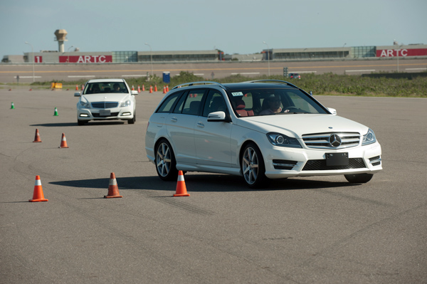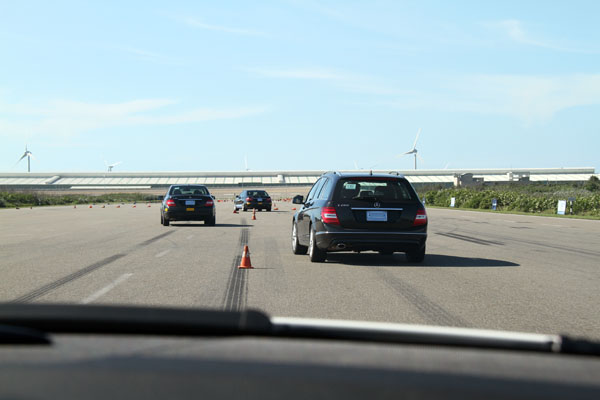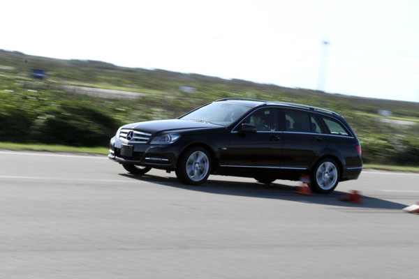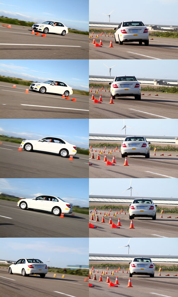 因此,在每一趟的體驗中,皆由教練駕駛E-Class於前方帶領,並且在媒體輪流體驗的同時,教練皆鼓勵於前導車後方駕駛的第一輛車媒體朋友可以跟於教練後方,學習教練的駕駛路線與煞車點,更迅速地掌握路線與車輛動態。而在車輛安排上則有兩部C 180 BlueEFFICIENCY、C 300 BlueEFFICIENCY Estate與C 200 BlueEFFICIENCY Estate各一輛。於不同車款的體驗結果是,動力最強的C 300 BlueEFFICIENCY Estate雖然衝勁十足,但是所要求的駕駛技巧也相對較高,若是在出彎或是繞錐時,即使其指向性相當精準,油門過猛反而很容易讓車輛偏離原來的路線。而全新加入台灣販售陣容的C 180 BlueEFFICIENCY,整體設定較偏像舒適取向,輪胎配置扁平比較高,因此在小角度的彎中支撐性會略受影響,但整體的穩定仍舊存在,動力部分則堪稱夠用;在此關的測試中,C 200 BlueEFFICIENCY Estate有著最均衡的表現,由其是動力部分最容易掌握且充足,因此相較於其他車型,也是最容易上手的一款。
