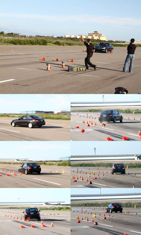 結束模擬賽道體驗後,緊接著的項目為高速麋鹿測試,麋鹿測試是在歐洲非常普遍的車輛迴避換道測試,用以模擬當車輛前方忽然出現障礙物時〈例如:公路突然竄出的麋鹿〉,必須緊急變換車道迴避後再回到原來的車道;而本次的測試場地則是於ARTC的煞車性能測試道進行,同樣以三角錐筒擺放出兩列平行障礙與車道,車輛行經至迴避區時,必須放開油門並且於第一道障礙前進行車輛換道,並至第二道障礙前再換為原來的車道,進行S行的迴避動作,在此之前,我們於相關的車廠安駕活動中皆體驗過類似地關卡,但是本次Mercedes-Benz卻將測試車速一舉提高到100km/h,而且還在迴避區放置測速裝置,確定每一位駕駛者都是以100km/h以上的速度進行迴避。