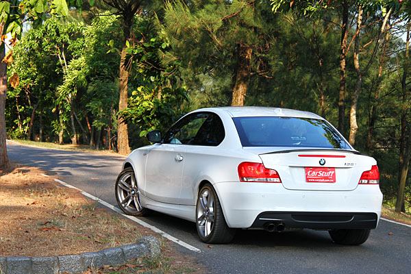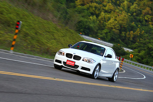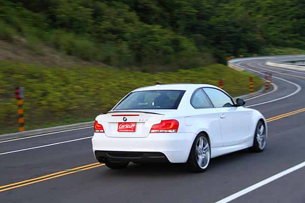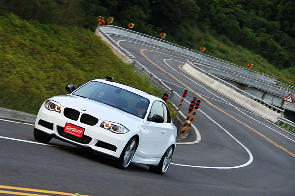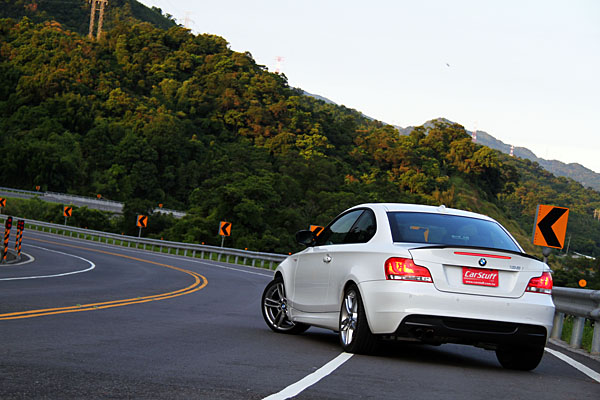 巧合的,上次體驗BMW旗下另一經典勁駒E90 M3 Sedan,途經台北知名山路106縣道,此次由於取景需求再度途經此山道,腦中還依稀保有與E90 M3 Sedan的激情邂逅,拼勁全力的奮戰與肉搏,雖然過癮但全身疲累;換至此次主角135i Coupe,雖然動力面稍微縮水,但搭配上彎道調性後,卻也更可恣意的操弄油門,切入彎道時的俐落令人熟悉,四輪不吭聲的以刀切豆腐般的通過前段彎道考驗,經過彎頂點後的大腳油門,後輪蠢蠢欲動的一展蠻橫,但在電子輔助系統的作動下,適度的拉回車身,但仍保有與方向盤稍為修正與拉扯的樂趣。這可是在諸多鋼砲對手中求之不得的精彩!而精準的轉向、清晰的路感回饋,標準的BMW作風毫無變味,換搭的M款跑車化懸吊雖然在平路時由於快速的作動反應,對應於顛簸道路給予了稍微不適的乘坐品質,但當滑過彎道時的Q感支撐,韌性十足的吸收側向G值卻又可同時撫平路面起伏,沒有如其他德系鋼砲般的硬派對抗,135i Coupe,在我心中地位絕對已超越130i手排!