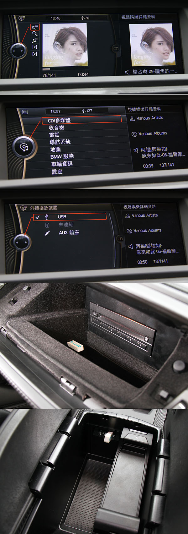 BMW Individual High End音響系統具備USB音源插槽與AUX-In外接音源裝置。