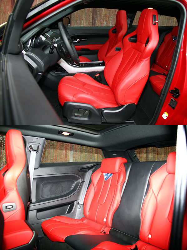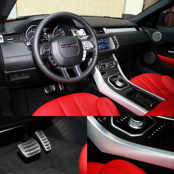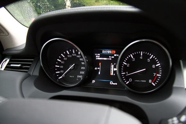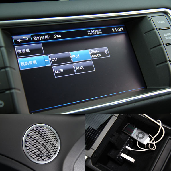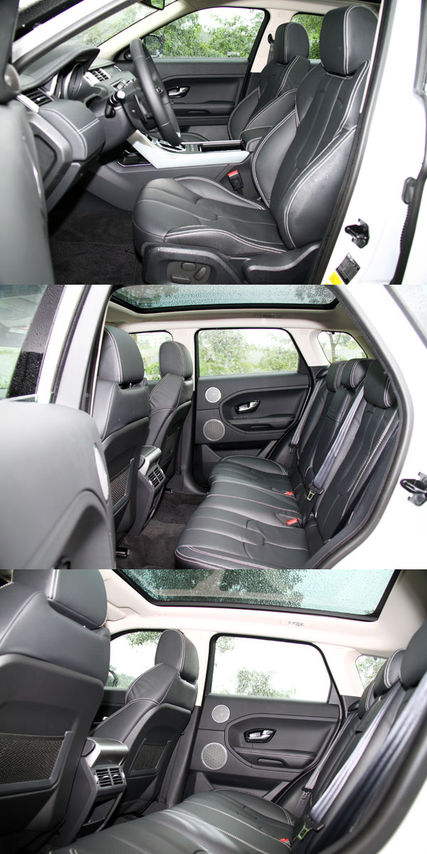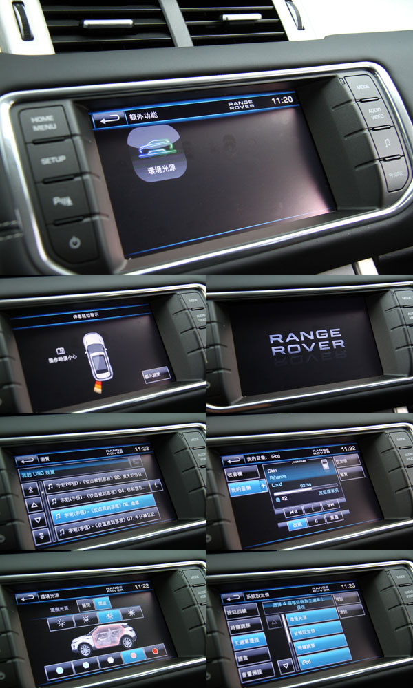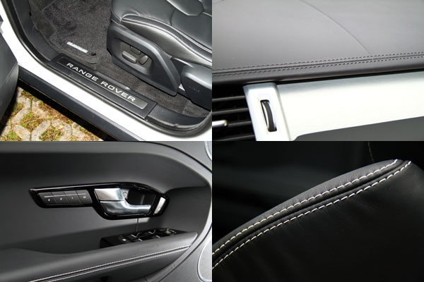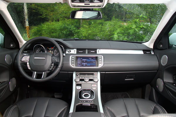 進入Evoque的座艙中,在新潮中保有Range Rover該有的豪華氣息,車內除了座椅、包括中控台、方向盤與車門內扶手旁襯板等部份皆以真皮包覆,並且採高質感的雙縫線縫製,同時,原廠也提供了多種顏色與不同飾板供消費者搭配,至於本次試駕的車款則是以黑色為基調與金屬飾板相搭配。而延續著LRX concept的漸層式T型中控台設計,操作介面皆回歸於現實,以簡單的按鈕排列給人簡潔感,中央的倒六角主框中配置了八吋具觸控螢幕功能之多功能資訊系統,配合兩側的快捷鍵,使用上相當便利,而且還提供了中文化介面,比起部分德系豪華品牌配置之類似系統始終未有中文介面,Evoque對於台灣的消費者來說相對友善許多。