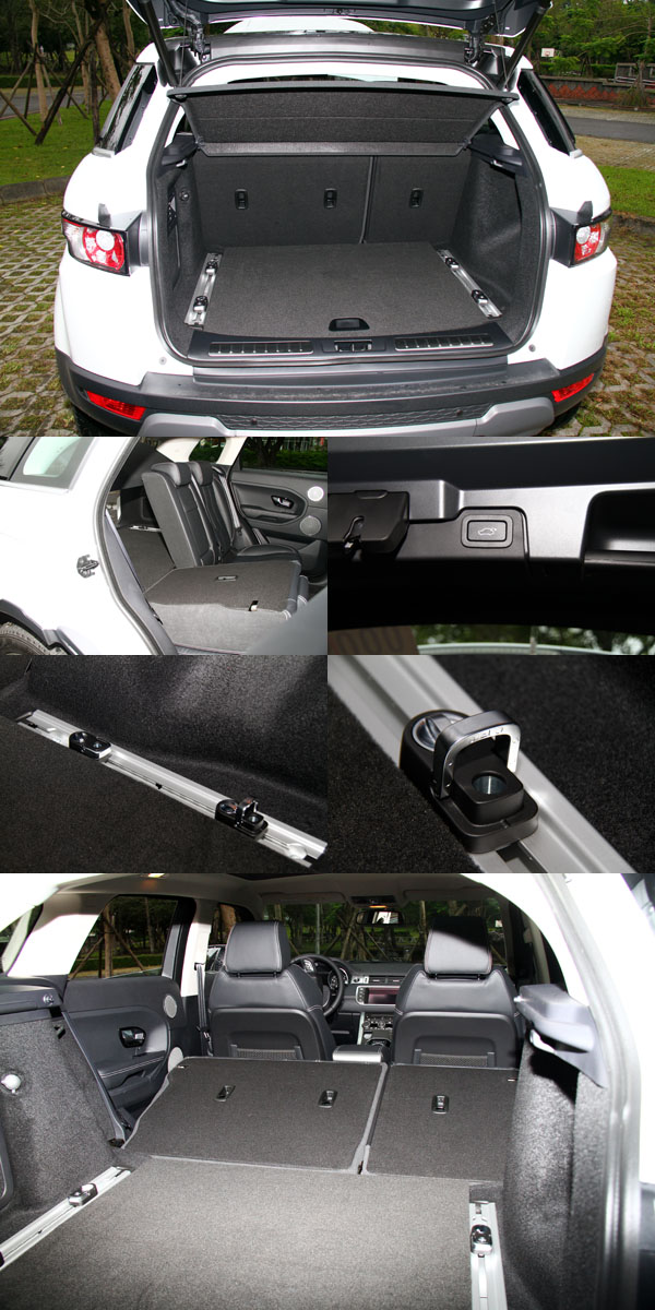Evoque在行李廂空間部分可透過4/6分離後座椅背翻倒機制,容積可於575L至1445L間調整,並且附有滑軌固定鉤與電動尾門等實用設計。