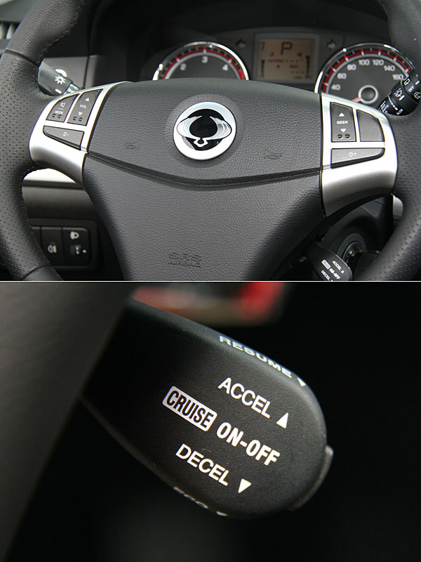 方向盤三點與九點方向的D+與D-按鍵為升檔與降檔設計;後方右側則提供定速裝置控制撥桿。