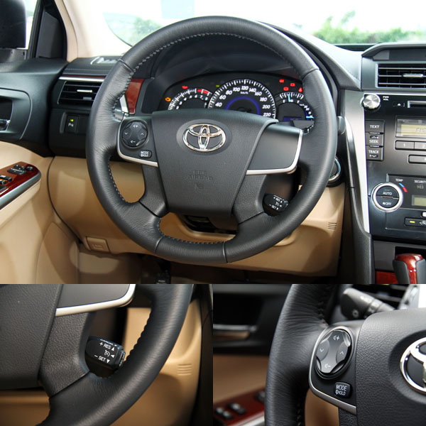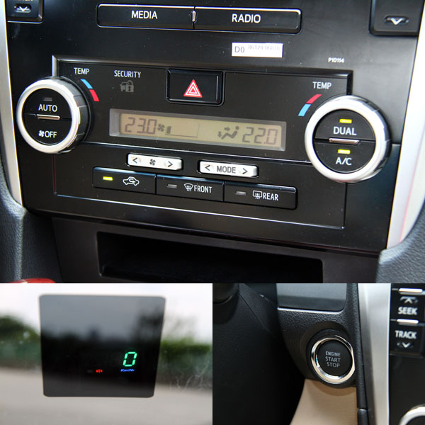 全新Camry 2.5在配備上並不算特別豐富,但包括雙區恆溫空調、具USB/Aux-in外接功能之音響系統、抬頭顯示器與引擎啟動鈕皆為標準配備。其中抬頭顯示器中可顯示時速與速限警示等功能。