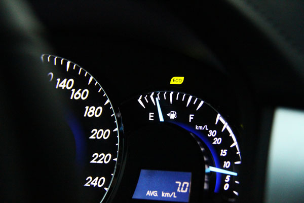 全新Camry車系在儀錶板中於右側增加了指針式的瞬間油耗錶與ECO節能指示燈,可輔助駕駛者以更節能的方式駕駛。