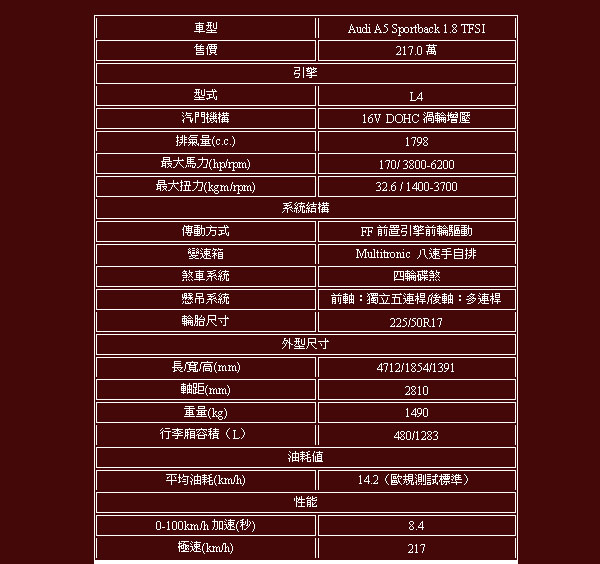 A5 Sportback 1.8 TFSI以車系入門之姿上市,售價為217萬元,是市場中200-250萬價位帶最具多元特性的轎跑車,而且斜背的設計並未影響車內空間太多,後座頭部空間也都在可接受範圍內,但斜背設計卻讓行李廂的運載機能大大的勝過傳統四門房車,加上跑車化的外型,相當適合喜愛創新事物的買家選購,也達到了一次滿足多個願望的需求!