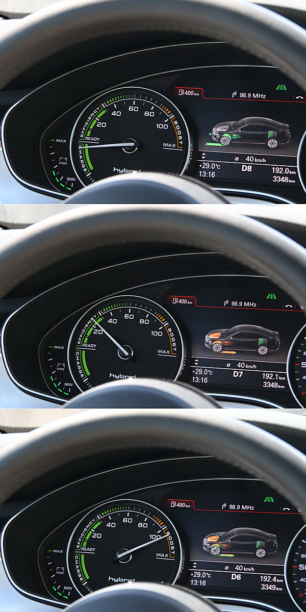 當墊持蓄電量超過一半時,便可從中控台的按鍵啟動純電動模式,此時儀表也會顯示;純電力行駛時,A6 Hybrid可以以時速60km/h速度,續航3公里;純電力行駛極速為100km/h。