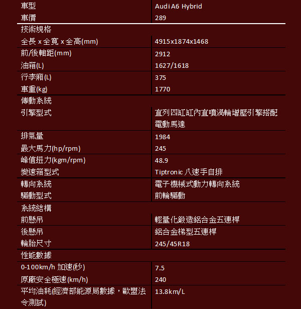 A6 Hybrid搭載缸內直噴渦輪增壓2.0升汽油引擎,整合電力驅動後,可具備245hp最大馬力與48.9kgm峰值扭力。
