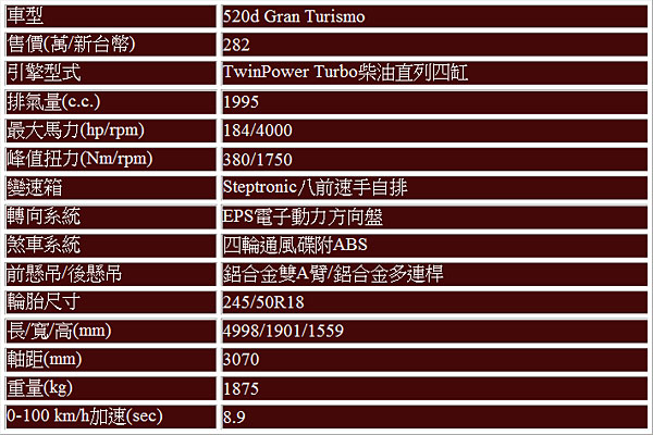 BMW 520d Gran Turismo基本規格表