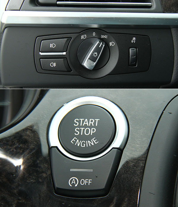 方向盤左側為燈組開關,右側則為引擎啟動鈕與怠速熄火裝置控制開關。