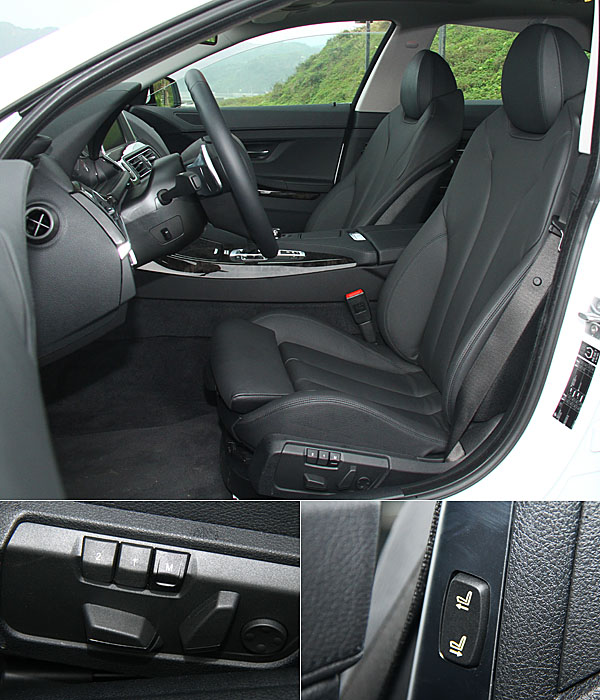 前座空間表現與6系列無異,640i Gran Coupe搭載雙前座電動跑車座椅含記憶裝置,後座可從椅側調整前座椅前後位置。