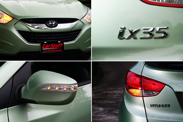 在ix35上,Hyundai汽車首度導入了所謂的「流體雕塑Fluidic sculpture」的設計原理,以明顯地刻線於車體鈑件上劃出紋理層次,使得車體在不同的光源下,由陰影地變化展現流動線條,其中在車側部分,融入類似轎跑車地Coupe Like元素,以所謂的Z-Shape高腰身特色線,將車側切劃出上下分層,前方的Z字線條是由頭燈末端開始向後延伸,至後視鏡鏡下方轉折向後,拉出地一個Z字,在沿著前車門把手上放至後車門把手向上轉折而上,劃出倒Z字,再與自B柱開始向下勾勒至C柱地車頂線條相連,展現出無比地動感,也迎合了時下跑旅車地新風潮。