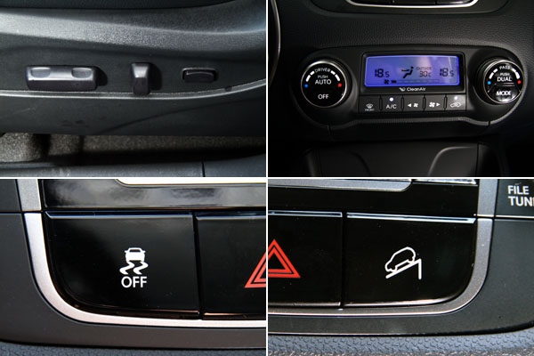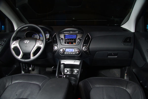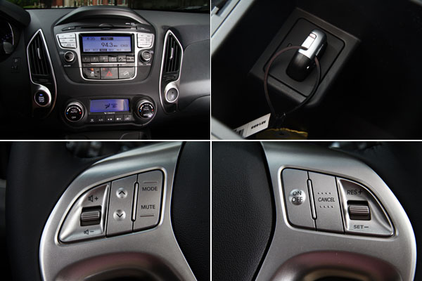 配備上,此回Hyundai汽車頗有誠意,以旗艦車款為例,具備了MP3讀取功能之CD音響、雙區恆溫空調、全景式天窗等,其中在音響部分,還提供了USB/Aux-in外接音源介面,而且該界面設計於中控台下方,並且於兩側整合了兩組12V電源插座,使用性非常便利,甚至優於i30設於前手套箱內的設計,由此我們可以發現,ix35在維持優異設計的同時,還維持了相當高的使用便利度,包括電動窗開關、方向盤快捷鍵等各項介面配置安排都非常就手;此外,旗艦車款還配有Push Star引擎啟閉鈕,因此在前中央扶手中還是有Smart Key專屬插槽,則是另一項貼心的設計。
