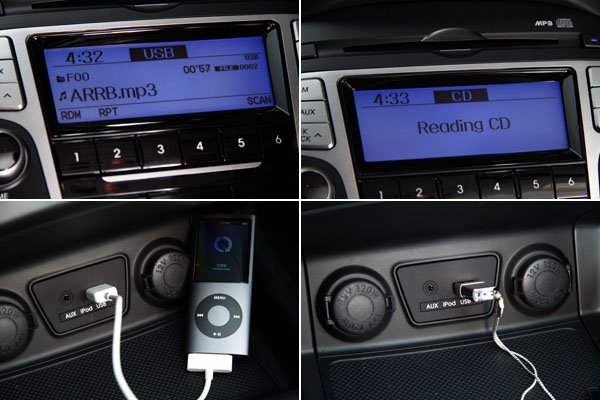 ix35搭載整合式CD/MP音響,一體式的設計,具備LCD顯示幕,可讀取MP3音樂格式,搭配6聲道揚聲器及Power Bass,不僅介面人性化,而且還配置位於中控台下方的iPod數位音源讀取功能,對應iPod及其他音源裝置,並可透過Aux-in 及USB連結隨身碟,輕鬆享受數位音樂。