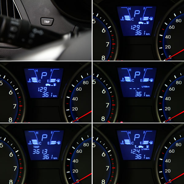 儀錶板中地多功能顯示幕,提供了包括油量、水溫、單躺里程、平均油耗、瞬間油耗、可行駛里程與累積行駛時間等功能,其中除了水溫與油量錶外,其餘都可藉由左側的TRIP鈕切換。