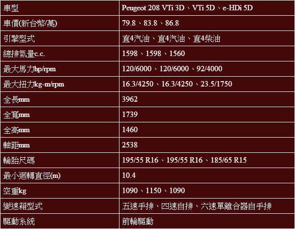 在正式發表時,我們就知道初期引進的208陣容,分別為208 1.6 VTi三門、208 1.6 VTi五門以及208 1.6 e-HDi五門等三款,售價則為79.8萬元、83.8萬元與86.8萬元,這部分很重要,因為這些208不僅三五門、汽柴油有別,同時也各自配上不同的變速系統,像是1.6 VTi三門就僅有五速手排設定,1.6 VTi五門則為傳統的四速手自排,至於最頂級的1.6 e-HDi柴油車款,則配的是六速單離合器自手排變速箱,以獲得更棒的油耗表現。由於試駕過程採取的是多車輪流體驗,因此兩天的行程裡,三款208都能徹底感受一番。