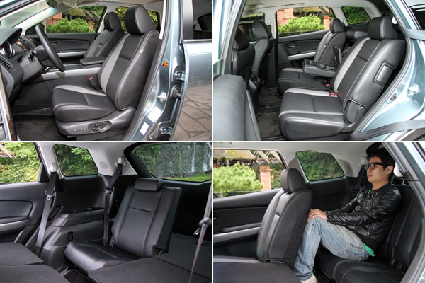 CX-9超過5m的車長,搭配上2875mm的軸距,在採三排七人座的設定下,具備了相當優渥的縱向乘坐空間,也許是被它緊致的外表所影響,一開始並不看好它的乘坐空間表現,由其是在的三排座位的部分,過去同樣有採三排座位設定的該級距對手,大多僅是應付短程運載為主,但是在CX-9上,卻可以提供一名身高170cm的成人乘坐,讓人留下深刻印象,而且第二排座位還具備前後13公分的滑移調整功能,可為後兩排空間做更彈性的運用;不過在頭部空間部分,第三排座位受到車頂下切設計影響,壓迫感較重,而且離尾門的距離也較近,安全感也受到影響。至於在行李廂空間部分,則是可在配合椅背放導機制,於487L~1345L間做變化。