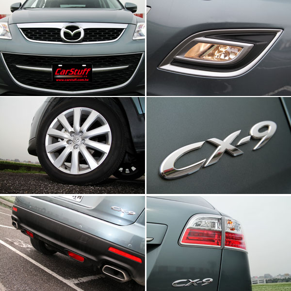 身為家族旗艦,CX-9擁有5099 x 1936 x 1728 mm之車身尺碼,是Mazda目前唯一超長超過5m的車款,但是外觀上在融入Mazda一貫的運動化線條,以及Crosover跨界元素與未及1.8m的車高,讓CX-9有著更為緊致修長地外表,完全沒有尺碼達5m大型SUV的壯碩體型;而整體的外觀設計仍舊是由五角型地鍍鉻水箱護罩為起點延伸,下方的同樣採五角型設計的大型氣壩,增添了霸氣與層次感,不過由於CX-9的旗艦地位,設計線條未如同家族其他車款那般奔放,改以較為柔和地設計,簡潔地勾勒出整車外型,給與人們更為莊重的氣質。