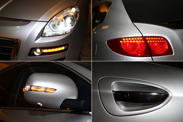 水滴式造型的HID頭燈、LED方向燈組、後視鏡上的LED方向指示燈、車尾的橫向式尾燈組等,展現出Luxgen7 SUV的設計潮流感。