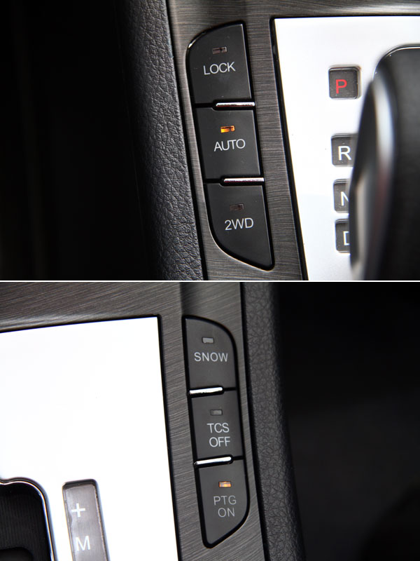 排檔桿兩側為智慧三模式4WD系統與動態輔助系統的控制按鍵。